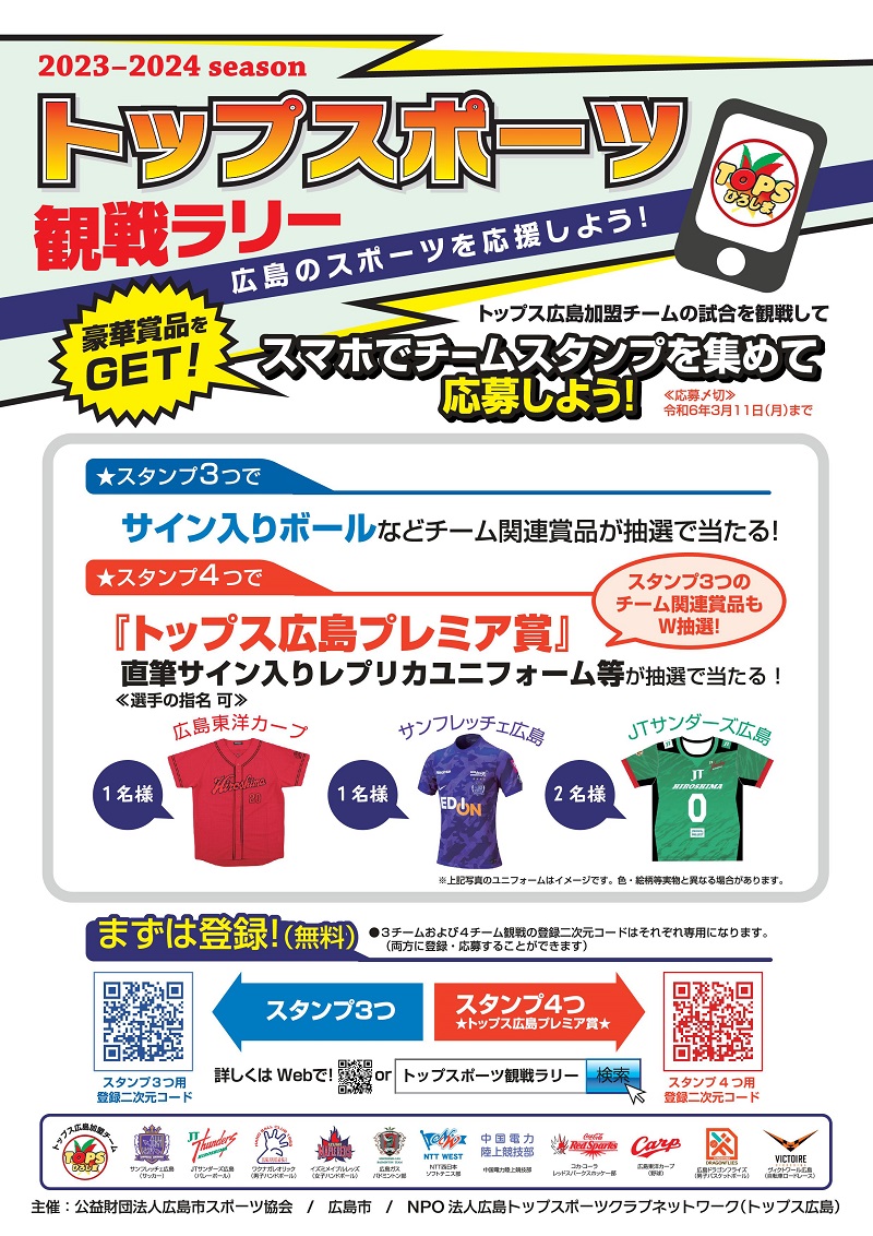 トップス広島加盟チームの試合を観戦してスタンプを集め(スマートフォンによるスタンプラリー方式)、チーム関連商品をゲットしよう!