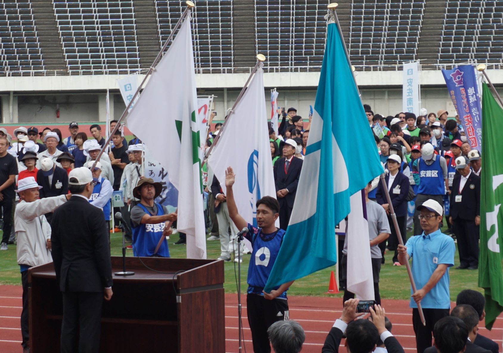 「第31回広島市スポーツ・レクリエーションフェスティバル」が、10月12日(日)に市内各地で開催され、ホットスタッフフィールド広島で行われた開会式では、川内学区が選手宣誓を行いました。