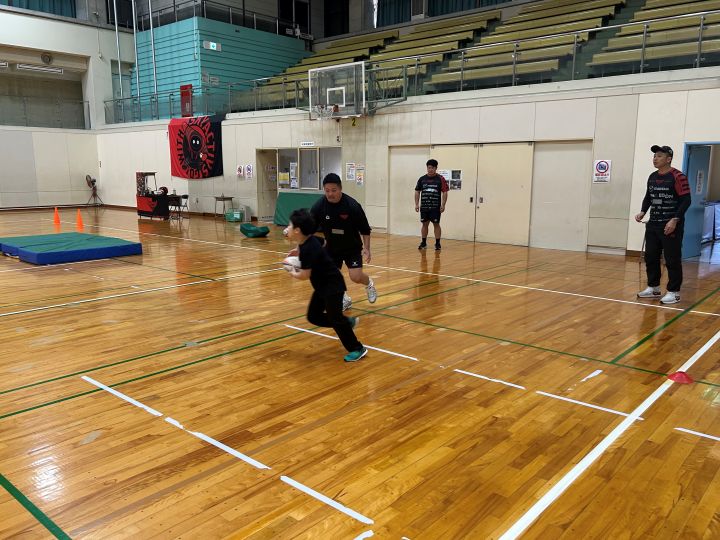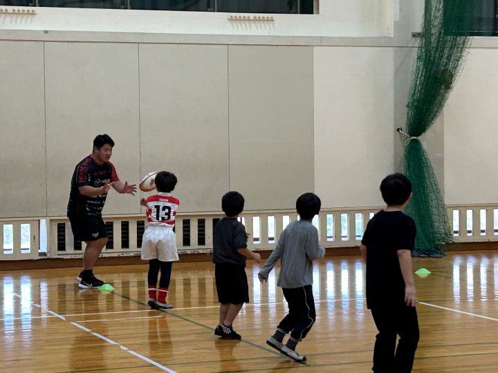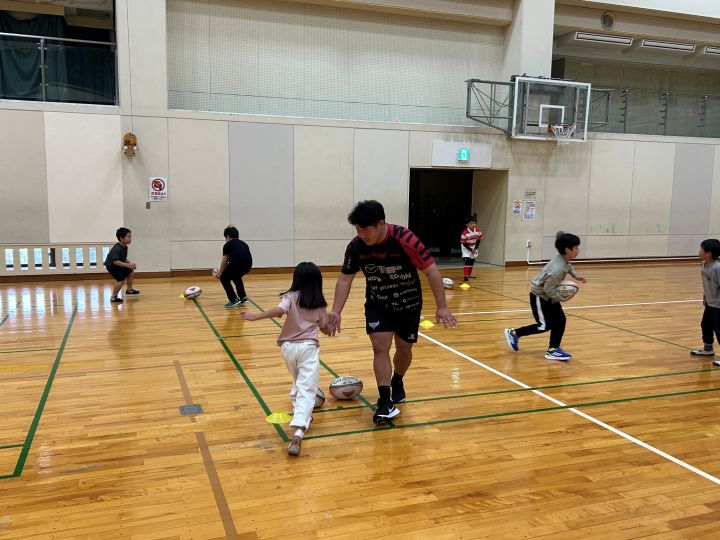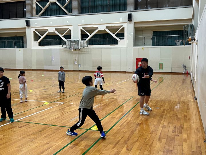 選手と参加者がワンチームになることを目指したプログラムで、ラグビーならではのパスの出し方や、トライの決め方について指導していただきました。