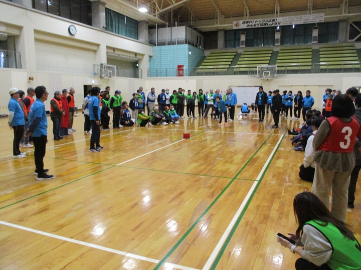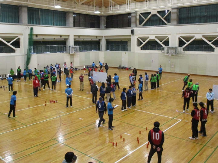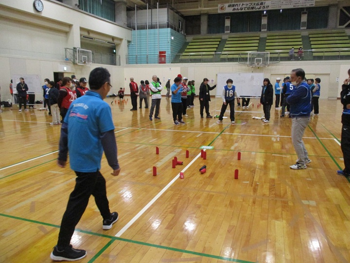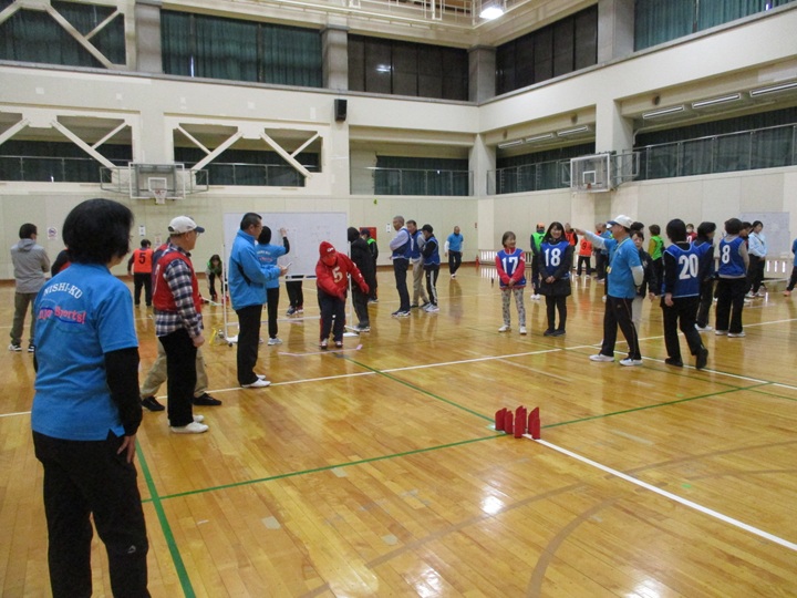 今年度はインドアモルックについての研修で、始めにスポーツ推進委員からルールやゲームの進め方について説明が行われた後、各学区でチームを組み実践しながらの研修が行われ、とても盛り上がっていました。