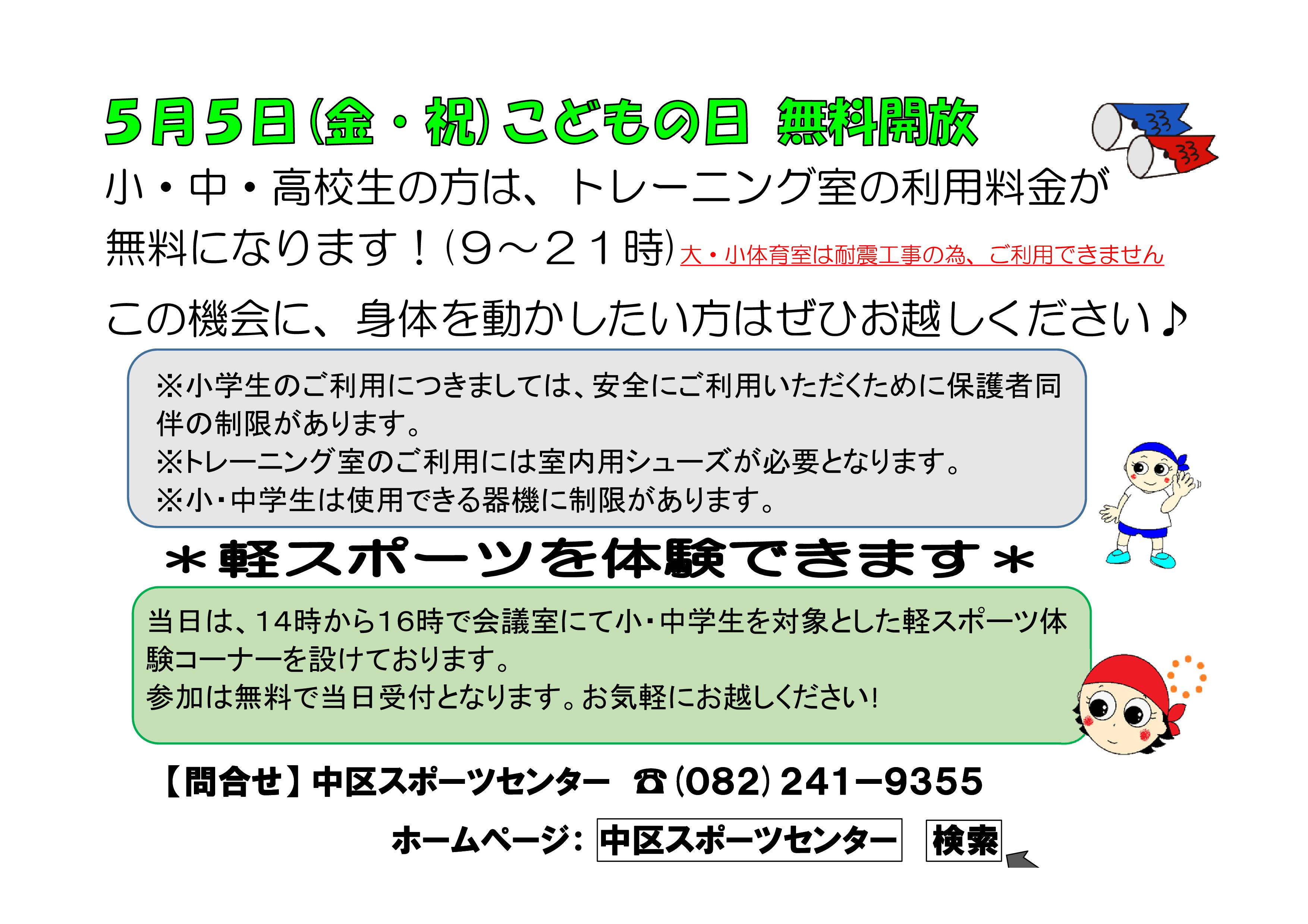5/5(金祝)のこどもの日は、小・中学生・高校生の方はトレーニング室の利用料金が無料となります。