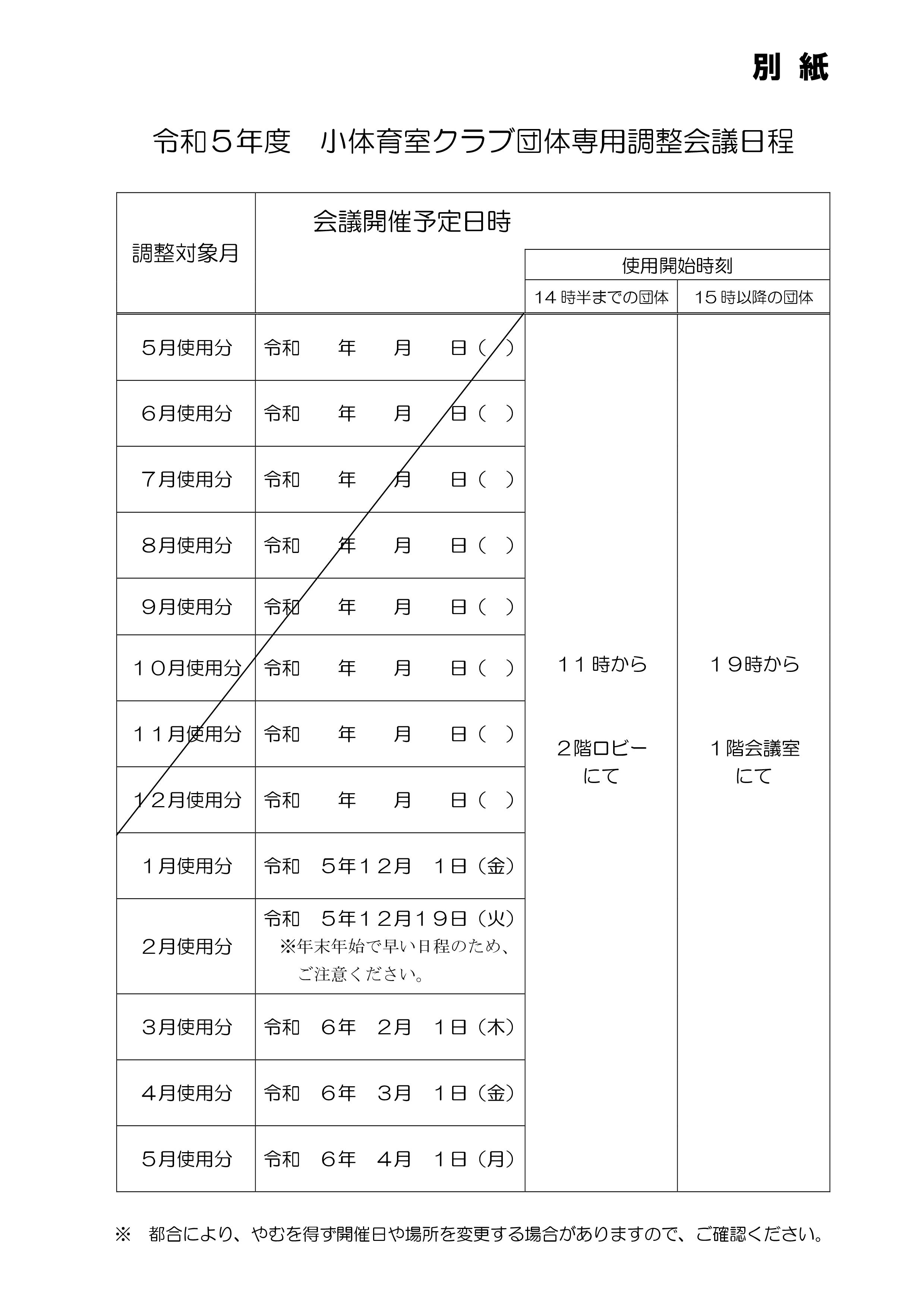 ・定期的な活動を希望されるクラブ団体につきましては、利用の均衡を図るために「小体育室クラブ団体
