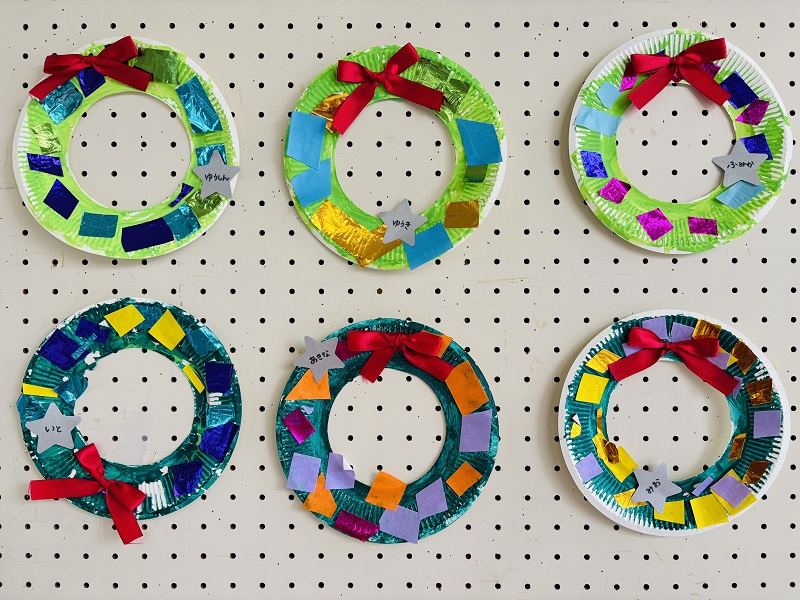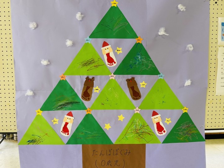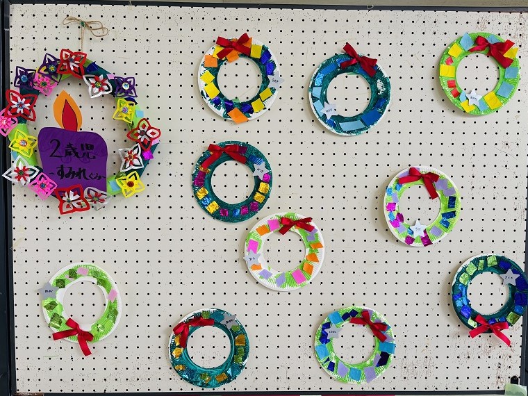 0~5歳児のみなさんが制作した、クリスマスツリー、サンタクロース、リースの作品です!