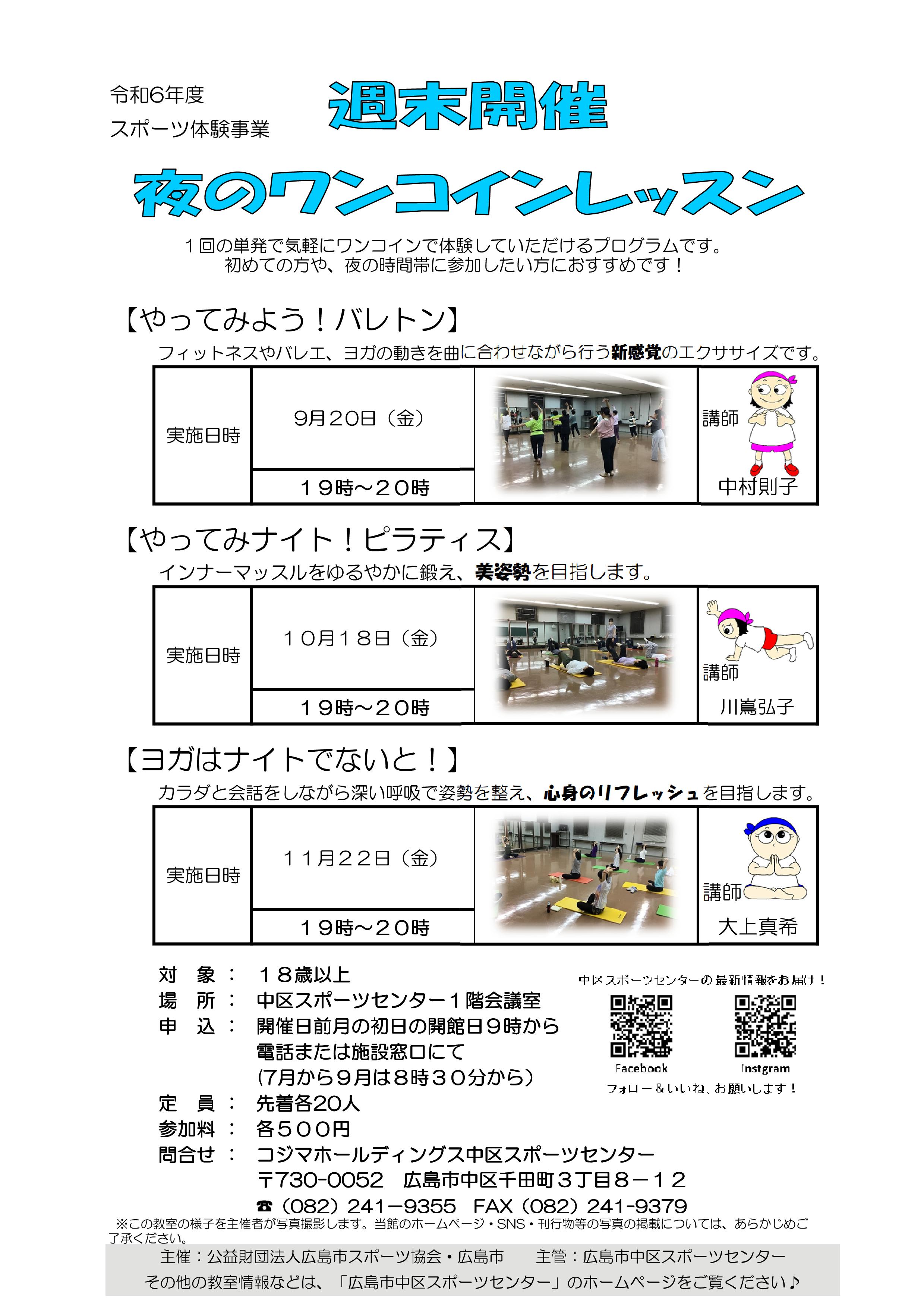 中区スポーツセンターでは今後も夜の時間帯のフィットネス教室を予定しています。