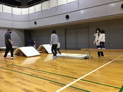 小学生になる前の体力づくりプログラムで、いろいろな用具を活用し運動神経の発達を目指します。