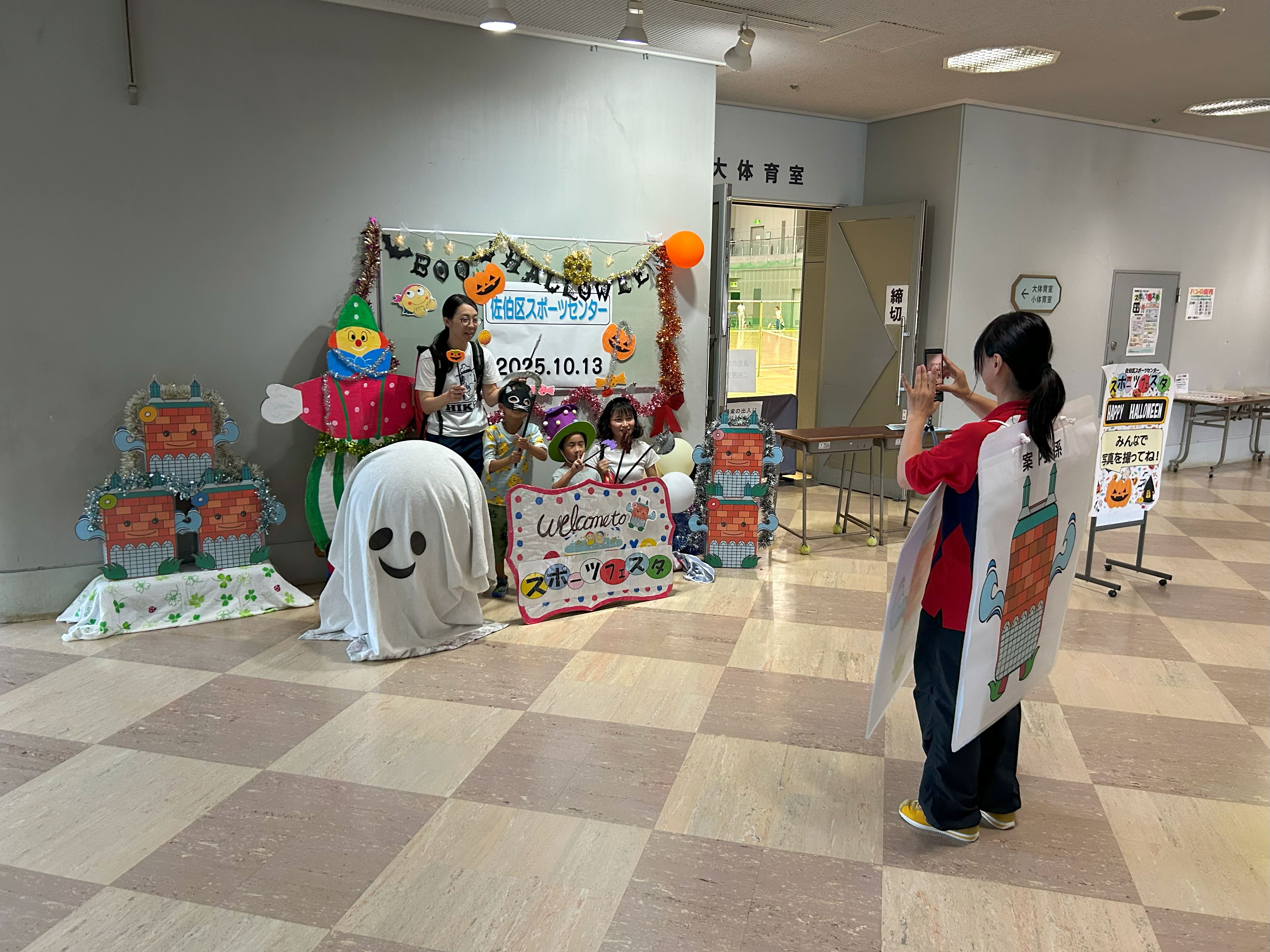 ロビーではハロウィンフォトブースを設置し、スポちゃん・きょうちゃんのイラストを使った手作りのサイコロパズルコーナーを設置するなどスポーツ以外にも楽しめるブースを設けました。