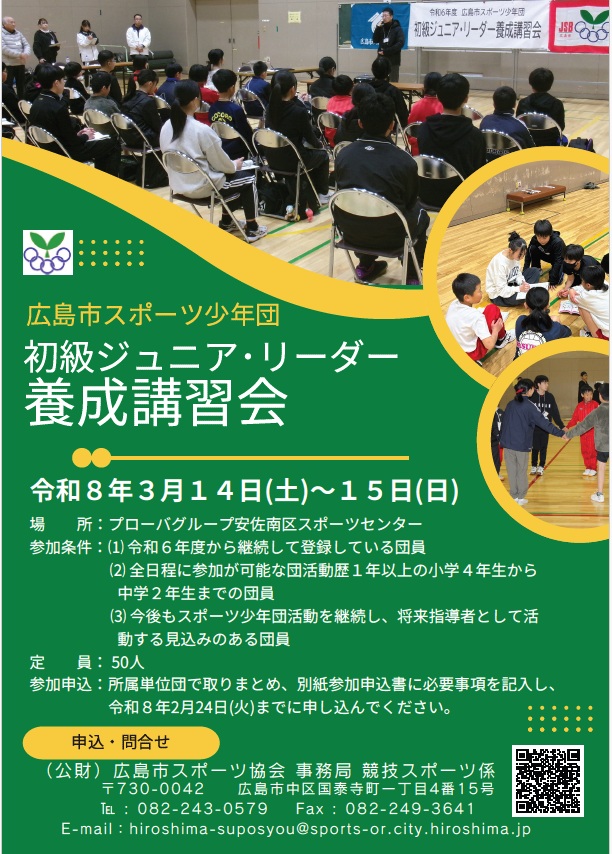 【参加者募集】初級ジュニア・リーダー養成講習会を開催します! Tweet シェア 印刷する 令和8年3月14日(土)、15日(日)にプローバグループ安佐南区スポーツセンターで令和7年度広島市スポーツ少年団初級ジュニア・リーダー養成講習会を開催します。リーダー活動に興味ある団員のみなさん!ぜひ、参加してくださいね!リーダー養成事業についての詳細はこちら ・開催要項 ・参加申込書 前のページへ戻る