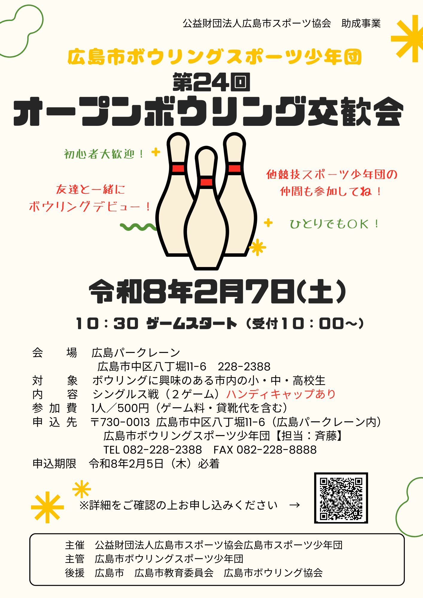 広島市スポーツ少年団第24回オープンボウリング交歓会が令和8年2月7日(土)に広島パークレーンで開催されます。