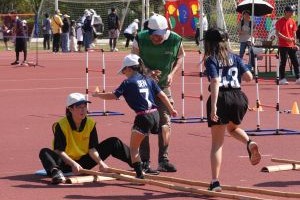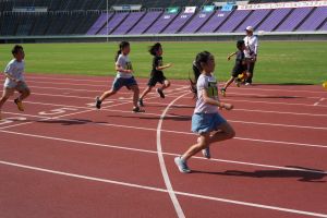 | 総合開会式(安佐南区選手団の 選手宣誓) | タータントラックを駆け抜ける「50mかけっこ」 |
